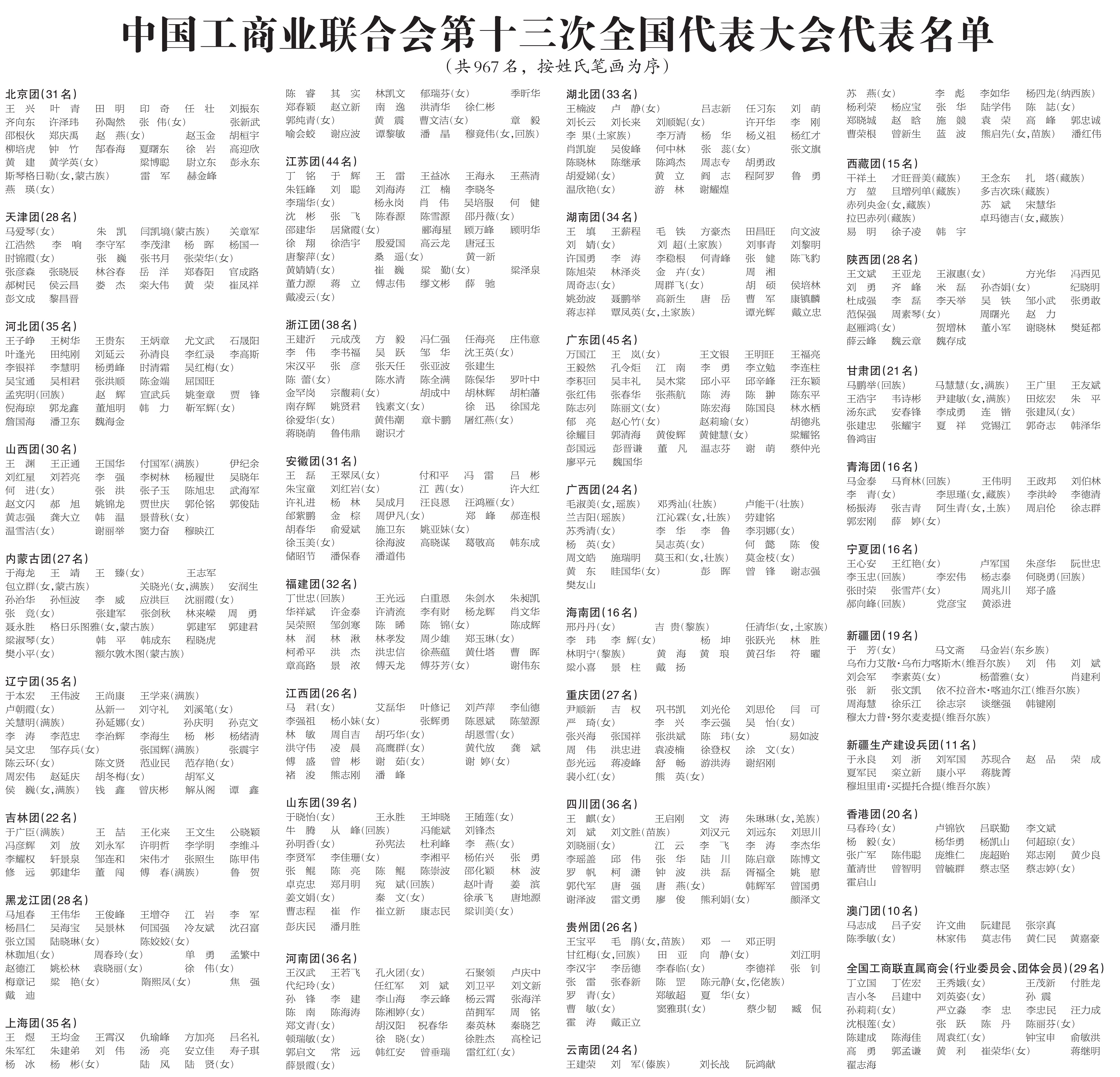 中國工商業(yè)聯(lián)合會第十三次全國代表大會代表名單